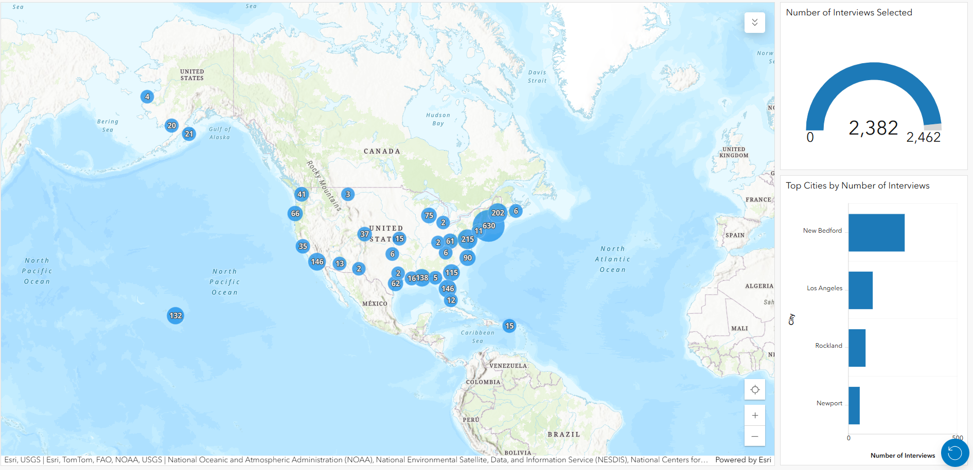 Static image of the Voices GIS dashboard. Shows interview locations of oral history interviews in the Voices collection.
